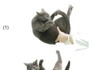 공중에서 몸을 바로 세우는 동안 반대회전 없이 앞쪽 몸통과 뒤쪽 몸통이 순차적으로 회전하는 것을 보여주는 대표적인 프레임 시퀀스. 이 시퀀스에서 고양이는 오른쪽으로 회전한다. (1...